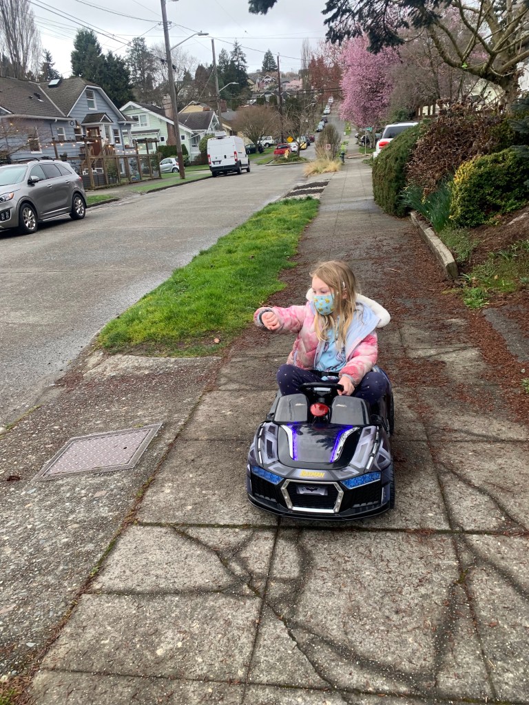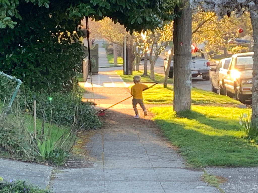 It’s Cherry blossom time in Seattle. Yay! I think these three trees with holes the size of the buses that drive the street regularly might be my favorite. They remind me of wisdom from poet Mark Nepo. “We don’t have to be finished to be Whole.”Someone wore his SuperMan costume every day this week. But even with the extra laundry (and one day he had to wear it damp), I’m all for it. After all, when we find something that makes us feel confident and strong, it’s worth wearing repeatedly!It gives me a little heart hiccup to see Miss O learning to drive already but thankfully the speed and the range of this vehicle keeps her close to home.Time for spring cleaning!We actually went to a restaurant this week. A complete novelty for Mr. D who has only been out to eat about a handful of times in his life, mostly when he was 7 months or younger. Fortunately Miss O is always willing to teach him how to handle situations. In this case, how to close your eyes so no one notices that you are going to drink their lemonade.