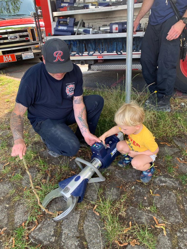 Mr. D and I bumped into an incredibly nice crew from Seattle Fire Department who let Mr. D hold their chain saws and cut sticks and lift dumpsters with the jaws of life. If they think showing almost 3-year-olds their gadgets is an effective recruiting tool, they are right.