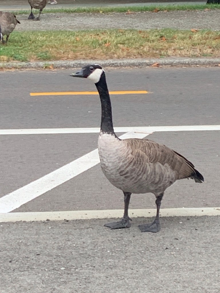 Wildlife at home – a raccoon eating plums in our backyard and a goose figuring out the neighborhood cross walks.