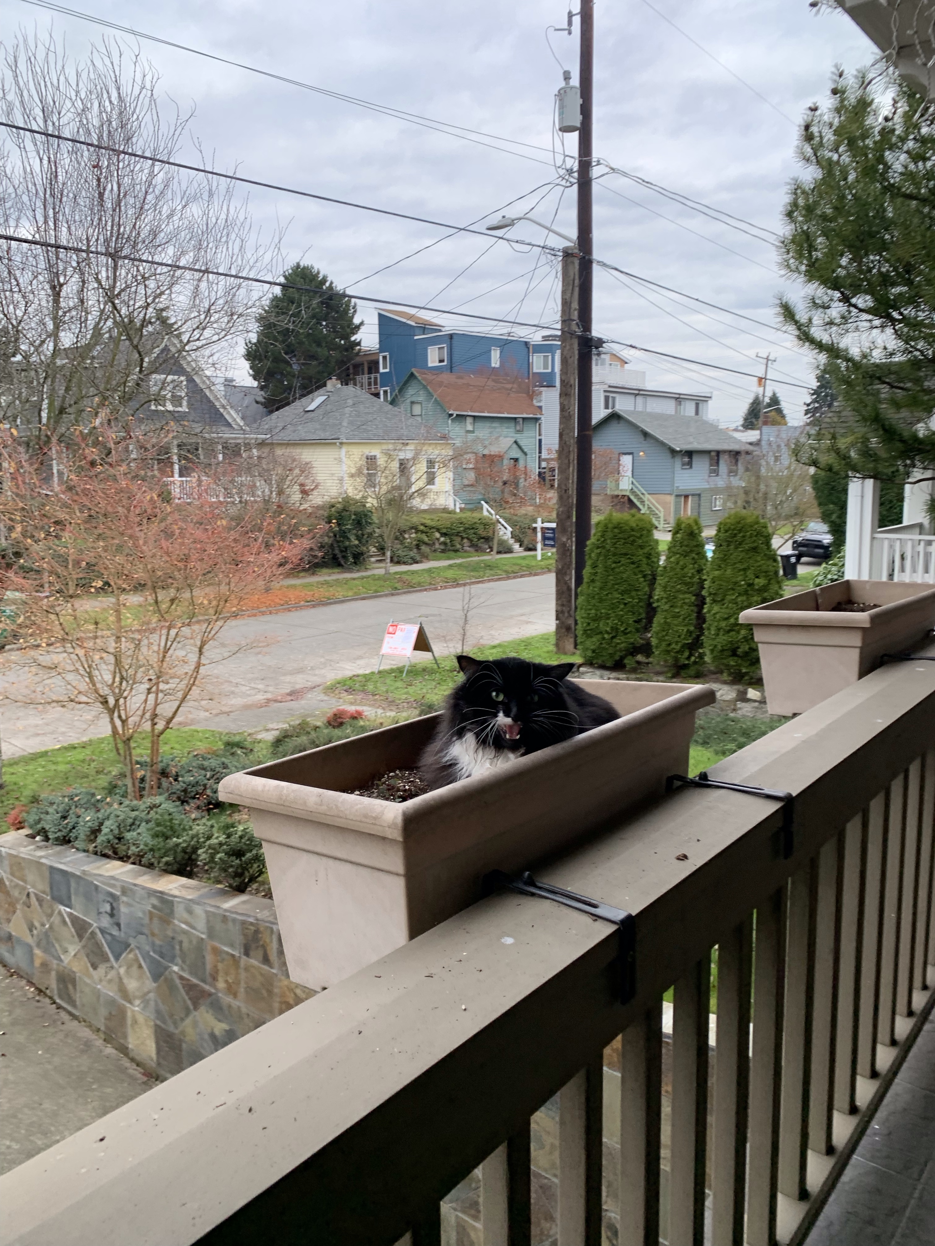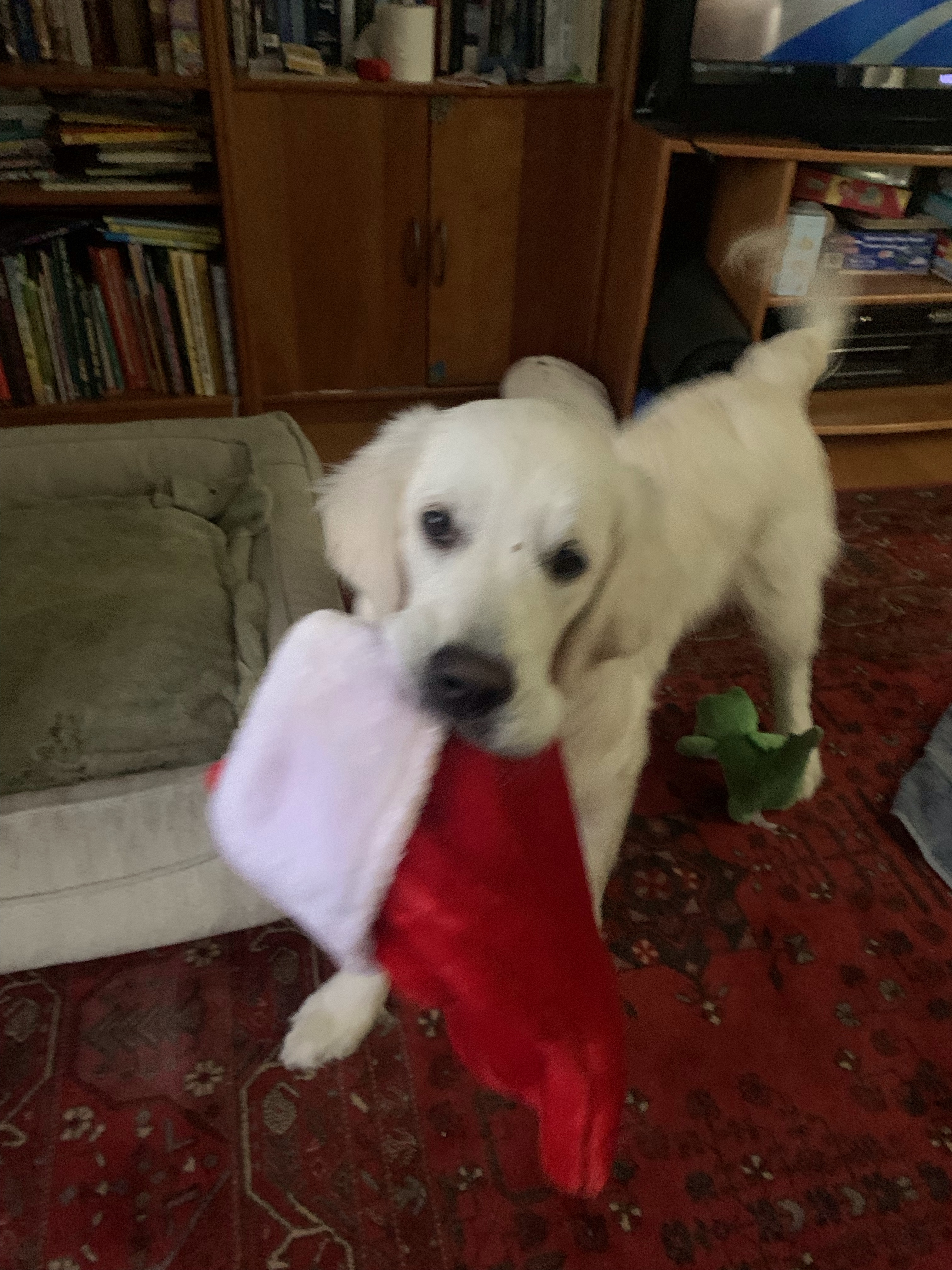 The pets seem confused this week. The cat is sleeping in the window box planters. Cooper is an English golden retriever in an American house carrying a Canadian flag. And Cooper also thinks the Christmas tree is a self-service chew toy stand.