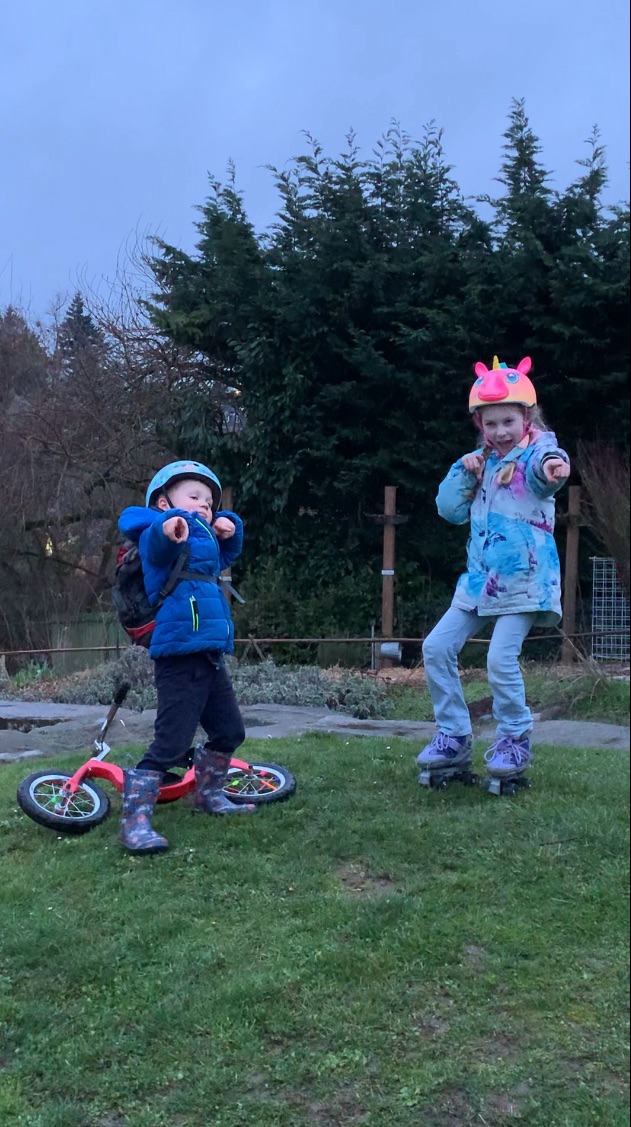 It felt like we did the same thing all week long. We picked some wheeled transportation and then meandered through the neighborhood to the small park. Then we repeatedly rolled down the grassy hill. But it was so fun that the kids wanted to do it night after night, regardless of the weather.