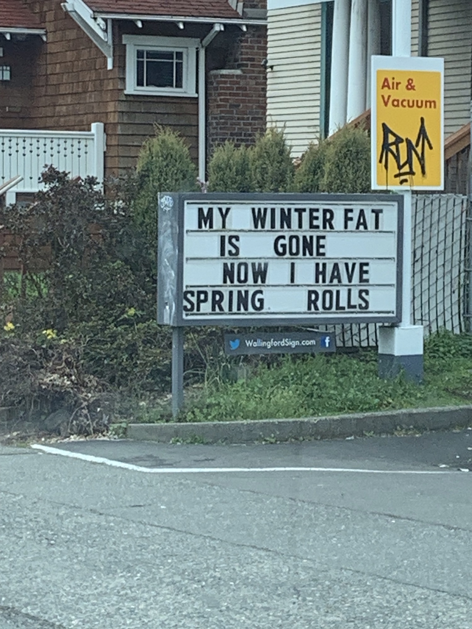I’m not familiar with the Mark Petruska sock sock thing, but I love the twinkle lights on the stairway wall—and I LOVE this week’s sign and the slimy sweaty wetty’s!