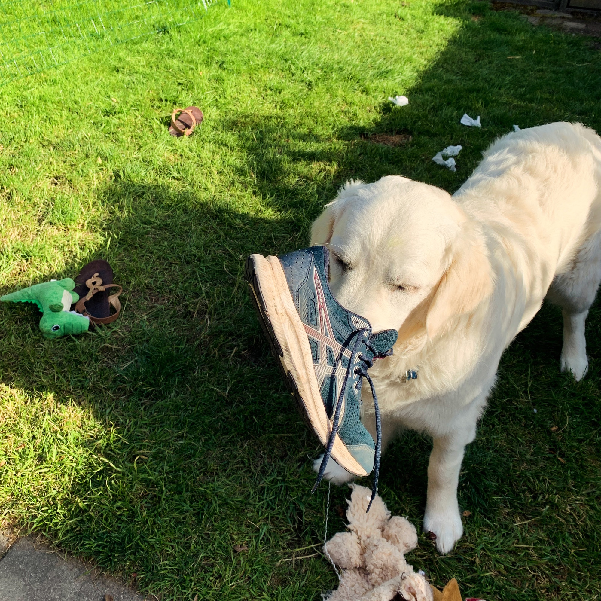 Cooper, that is not what “good taste in shoes” means. But you are learning how to cross paws!