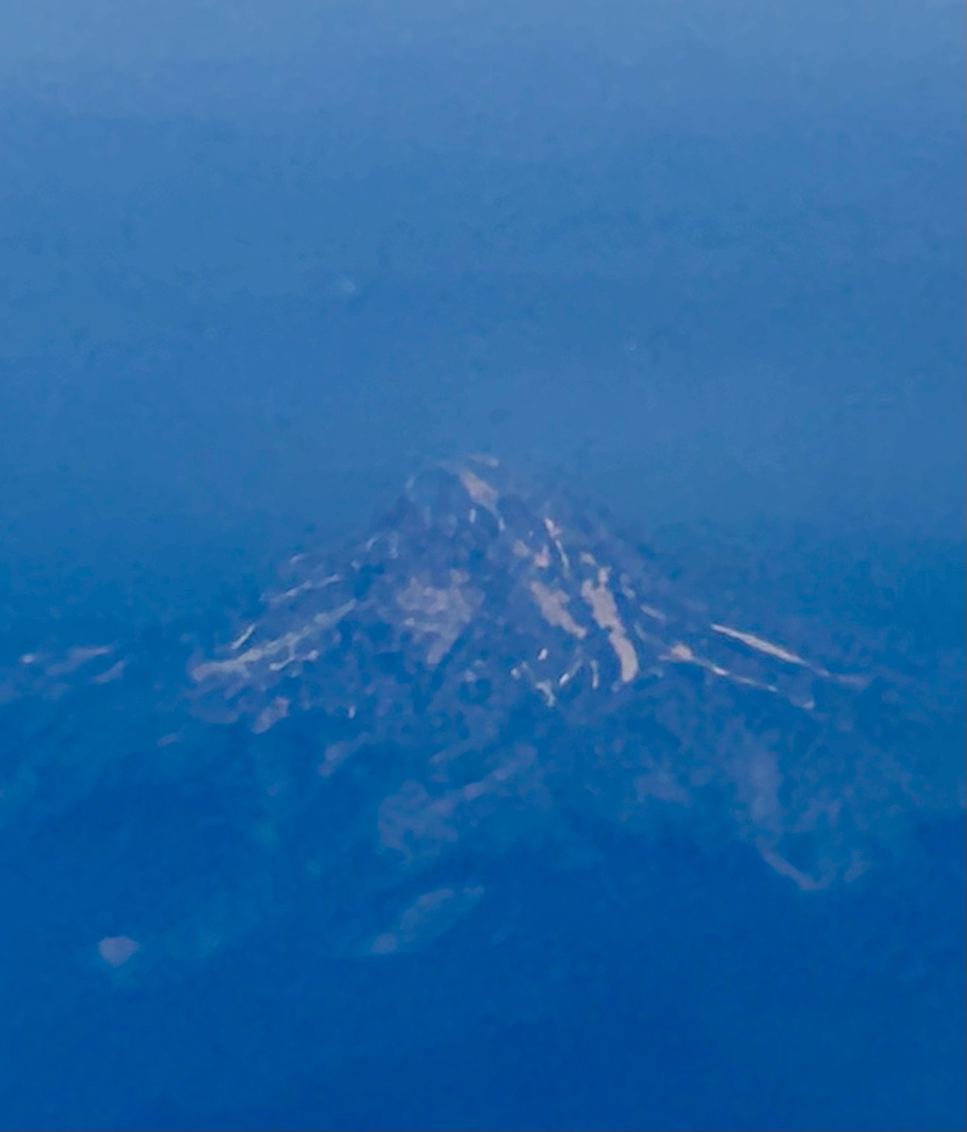 Mountains from the plane. Left one is Mt. Rainier (14,411 ft), middle is Mt. St. Helens (8.300 ft.) and the third is Mt. Hood (11,249 ft).