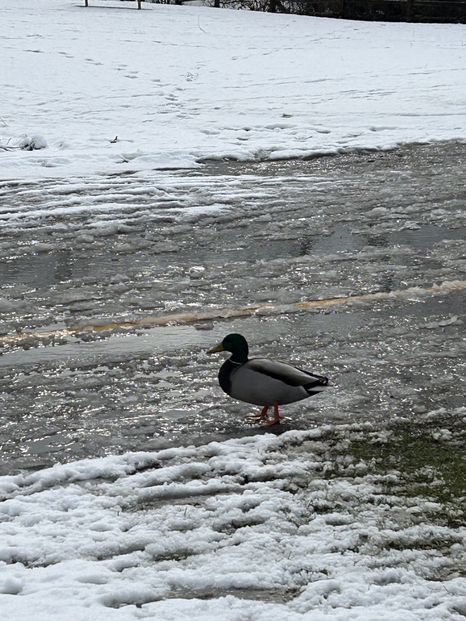 The ducks down by the lake seemed less impressed with the snow. There was a lot of quacking which I interpreted as “What the duck??” 🙂 Mr. D also found that wet snow is heavy to shovel.