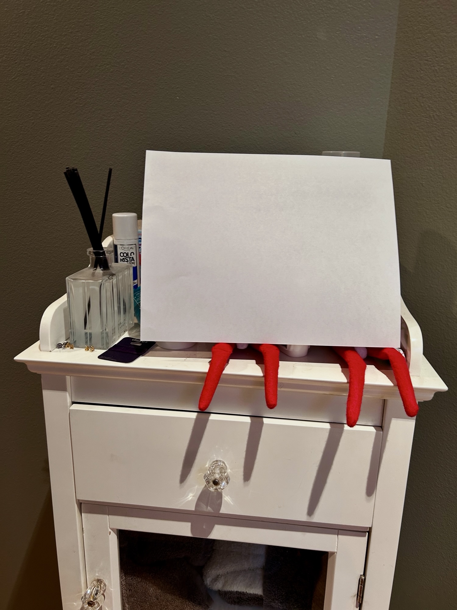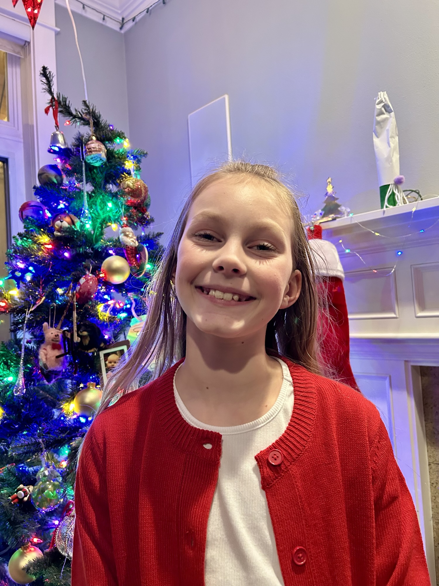Ten-year-old Miss O smiling after singing in a lovely Christmas concert. The Elves on the Shelf might be smiling but we don’t know because they landed in the bathroom. Mr. D installed a privacy screen so no one had to feel embarrassed.