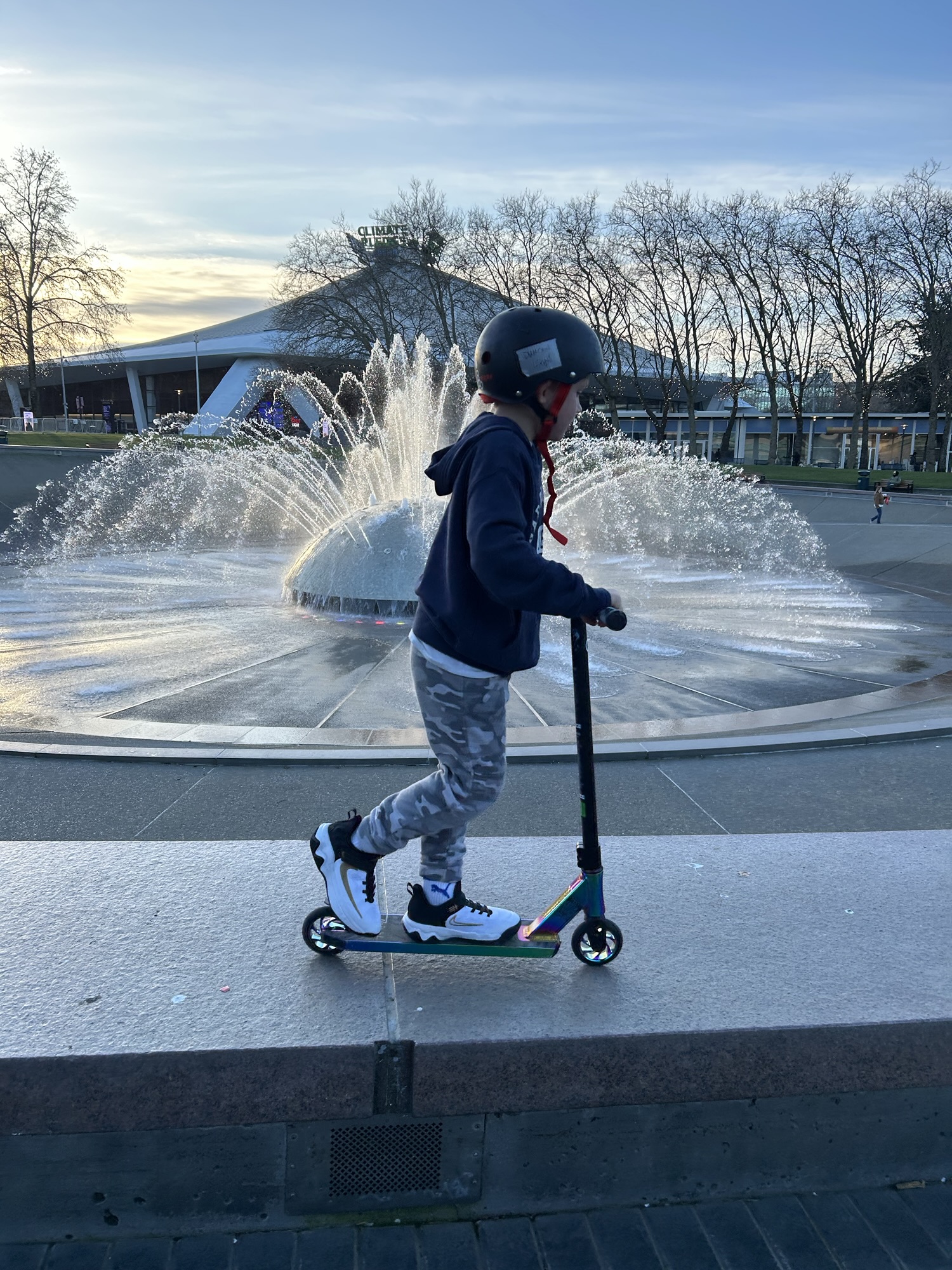 Mr. D and I were down at Seattle Center waiting for Miss O to finish a dance class. This scooter picture is taken just moments before I asked him to do a trick. The water of the fountain varies in intensity (and reach) as it performs its own show. Unfortunately, our timing was off, the fountain went full force, and it totally drenched him. But it was a great trick!