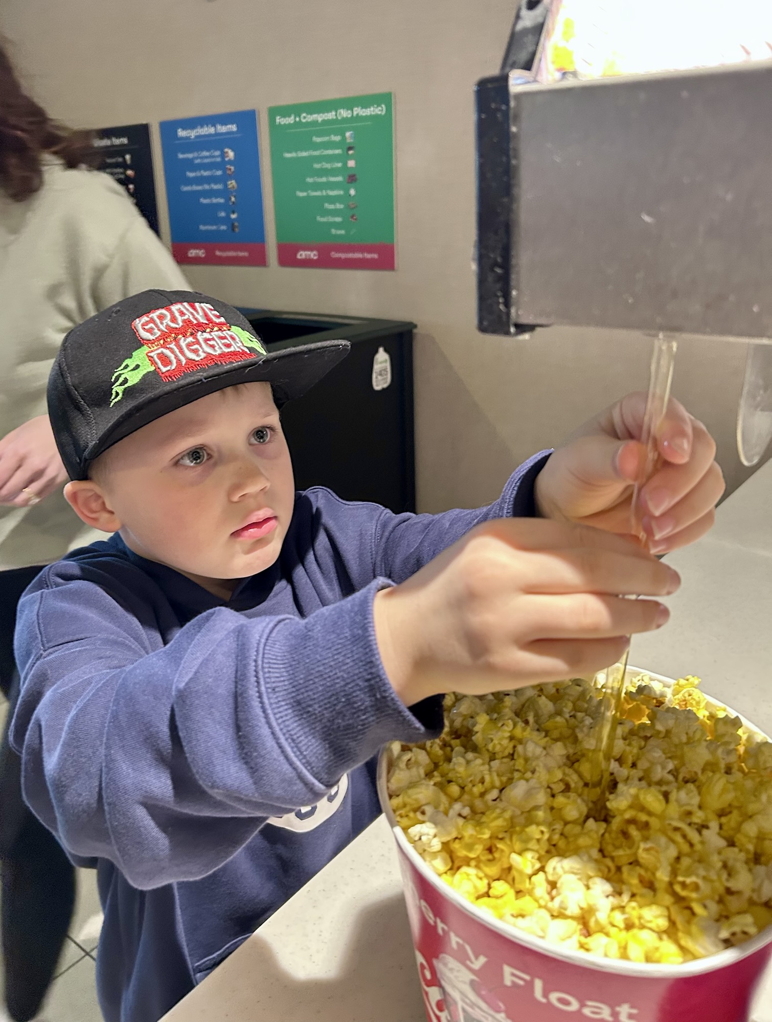 Copying another movie theater patron’s method of using a straw to get butter to the bottom of the popcorn bucket. Yum, says Cooper.