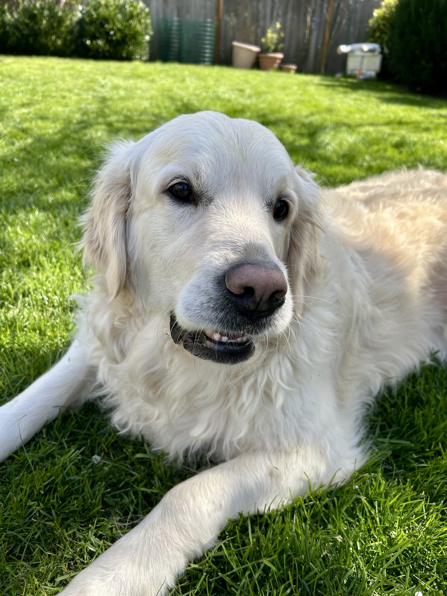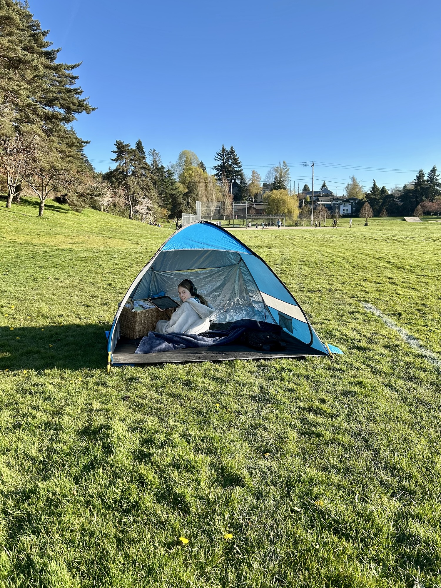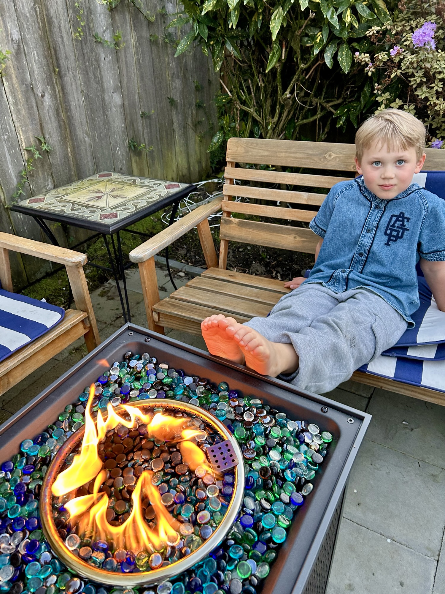 Backyard fun — but it’s still cold enough to have to warm up our feet.