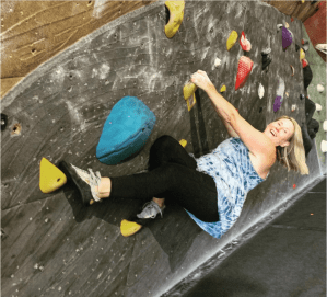 One of the most ironic is that I have a fear of heights and yet I choose mountain climbing and rock climbing as hobbies and tried to just stampede over my fear. I remember a few years back doing a bouldering route at the climbing gym. These bouldering routes 12 -18 feet high and are climbed without ropes in a section of the gym padded with thick mats. I was on a wall that was angled out so I was climbing horizontally, my body almost parallel to the ground, couldn’t see what I was reaching for, and needed to shift my weight carefully to stay on the wall. I was in a position somewhat like I am in the photo below but I wasn’t smiling!