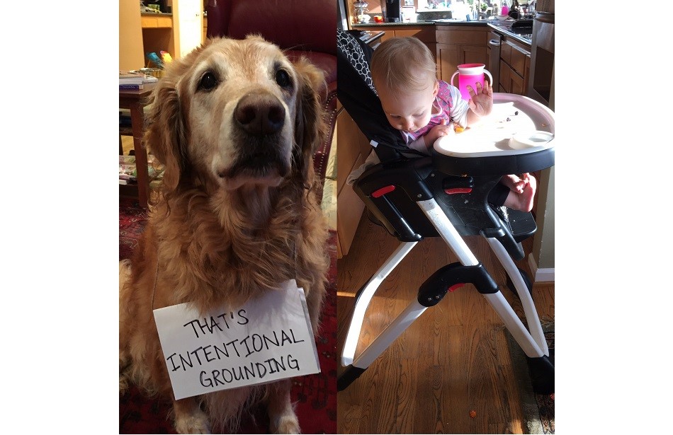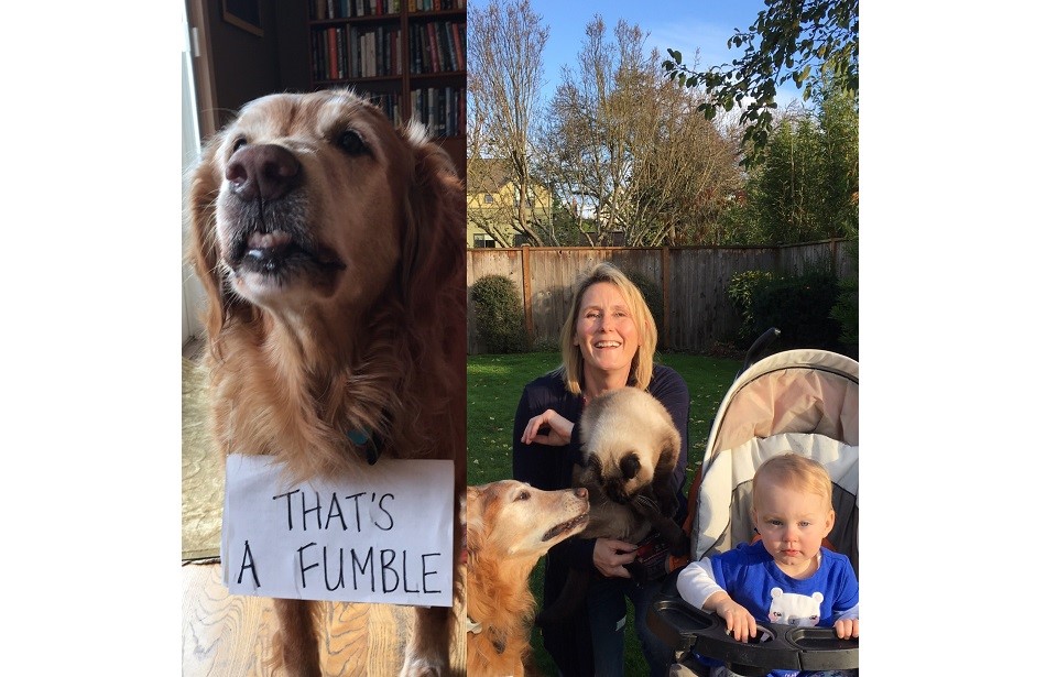 Is dropping a cat that wants down really a fumble? Perhaps Biscuit is talking about our attempt to take a picture together in general…