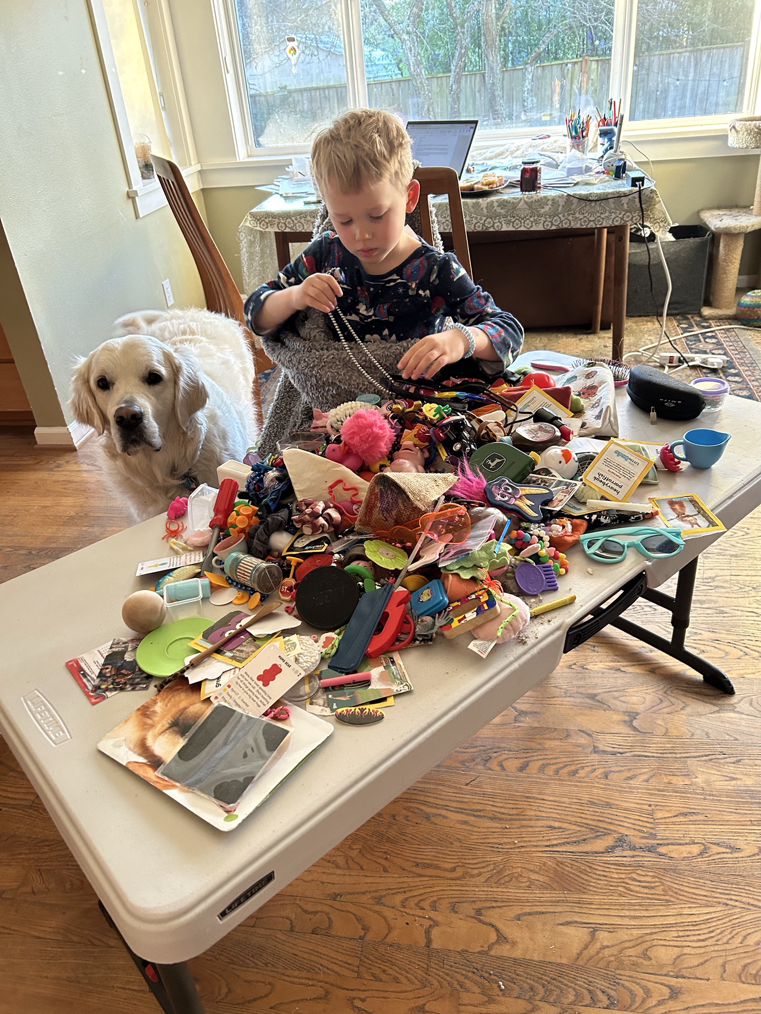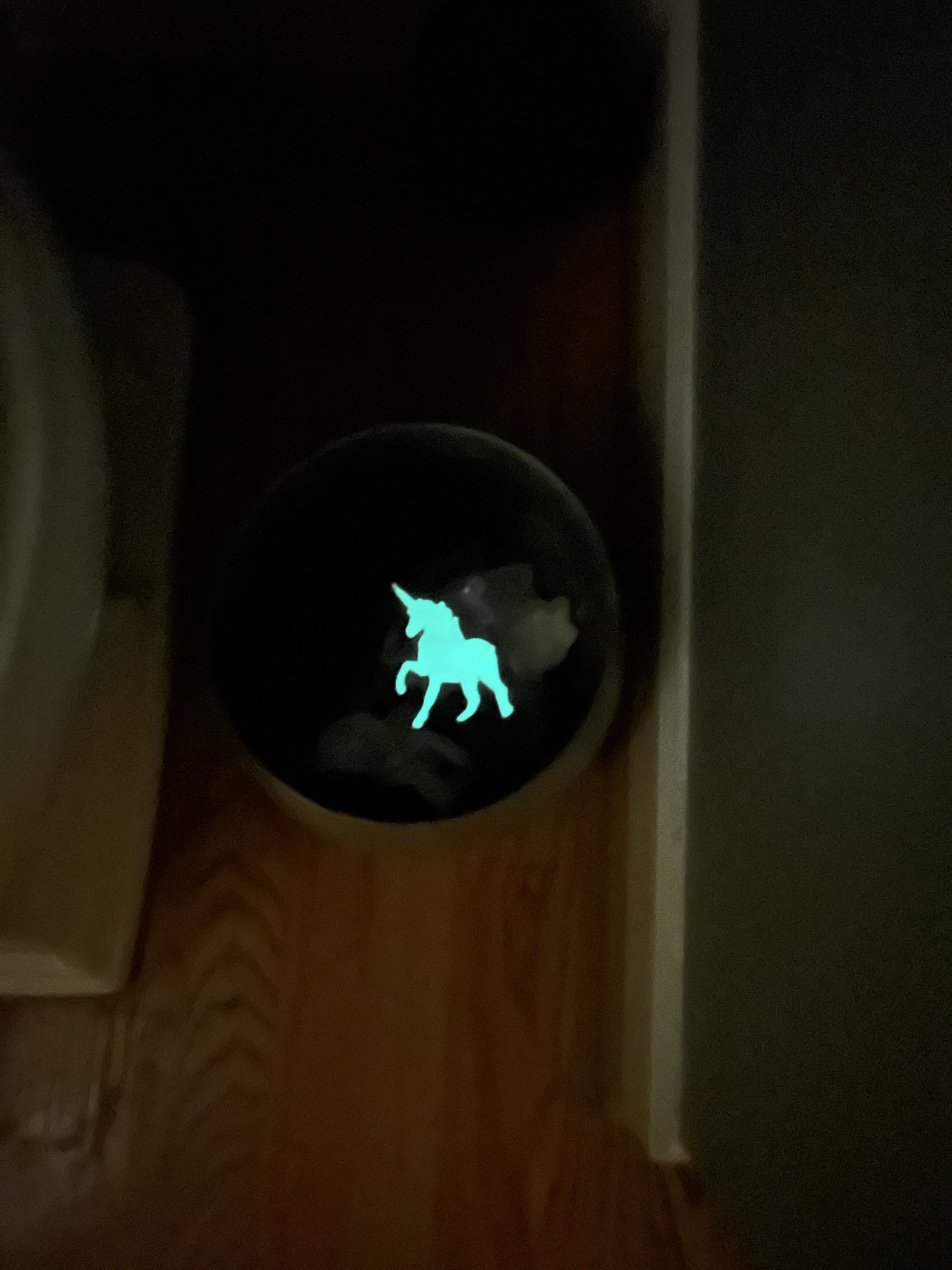Decluttering kid stuff. Oh my – we have a lot. I threw a unicorn sticker in the garbage after Cooper chewed it. But after dark, I discovered that even digested and discarded unicorns are magic.