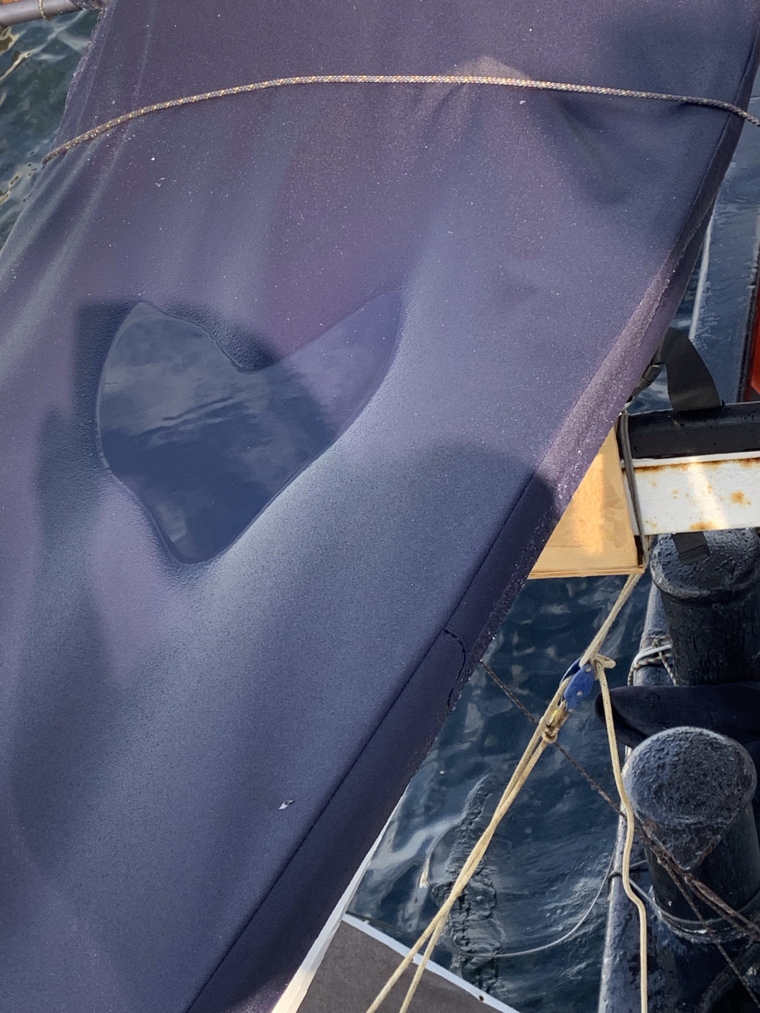The sign and the heart of the week. The heart is a puddle of water on a slip cover for a boat.