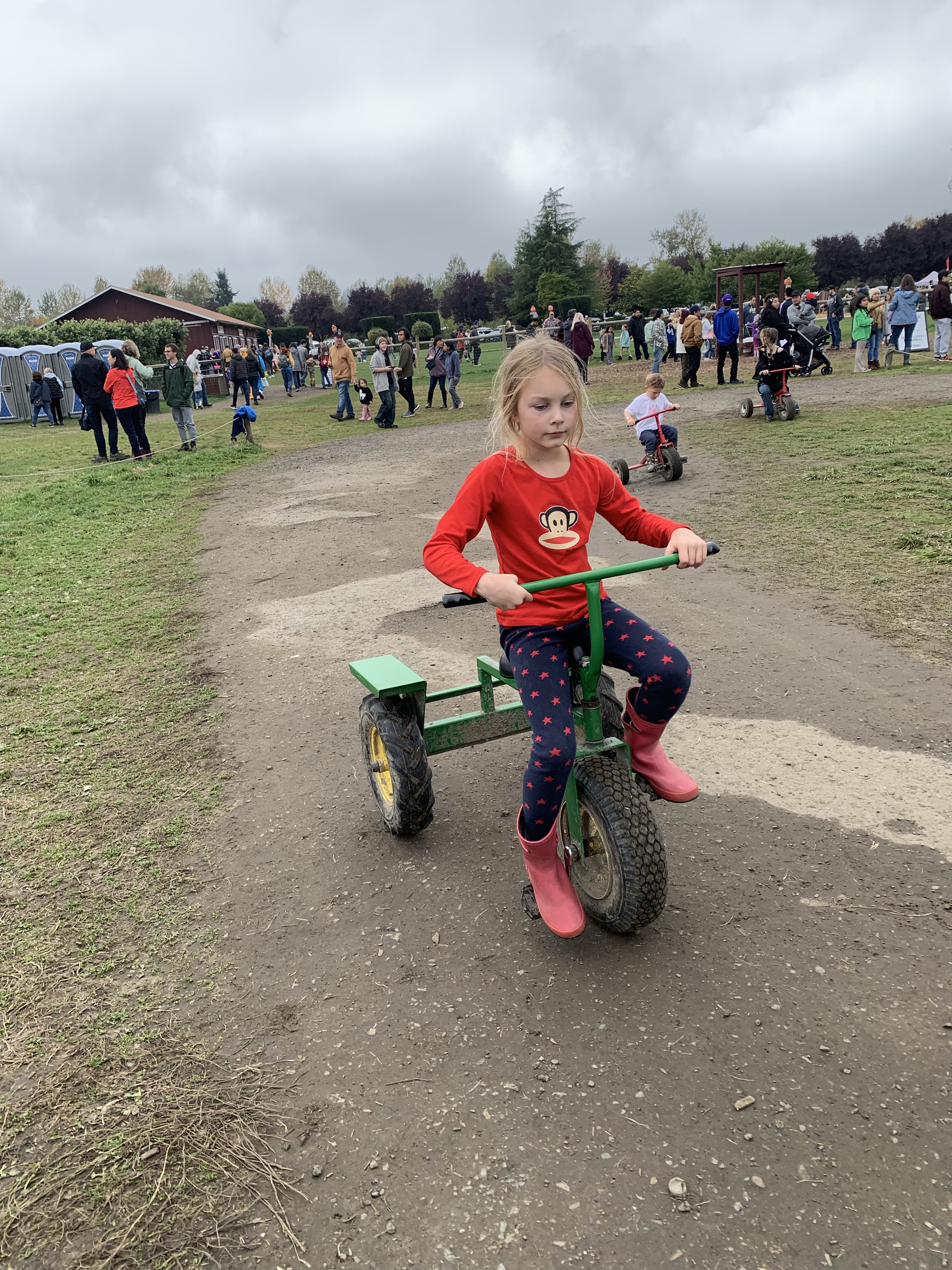 We found a really fun pumpkin farm for a fall festival. It had a ninja course, zip lines, hay mazes, live animals, and great slides. But the biggest hits were the corn pit (they probably called it something more marketing friendly than that) and the tractor bikes. Every outing with coats on since, I find a steady trail of corn that continues to drop behind.