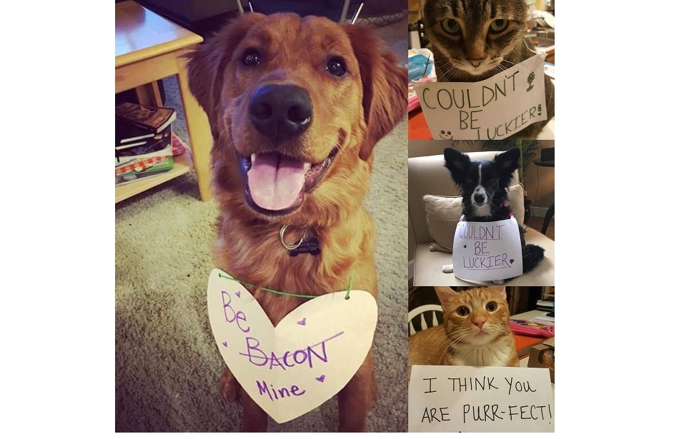 Celebrating the love of our most faithful and constant companions this week – our pets! What “conversation heart” would your pet pick? Buddy, Sam, Kelty and Phoebe (clockwise from top right) share their selections.